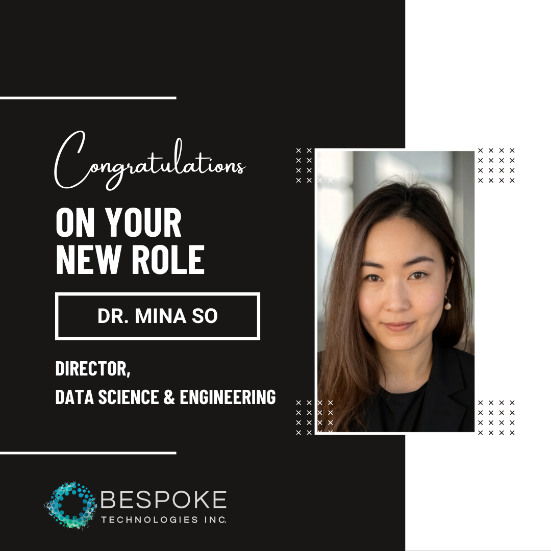 Bespoke is pleased to announce a key promotion within the organization: Mina So, PhD has been promoted to Director of Data Science & Engineering (DSE). In this role, Dr. So will lead the execution of DSE programs, strengthen employee outreach, enhance customer support, oversee training initiatives, and support staffing across the DSE portfolio. Her dedication and leadership have made a significant impact on Bespoke, and this promotion reflects those valuable contributions.