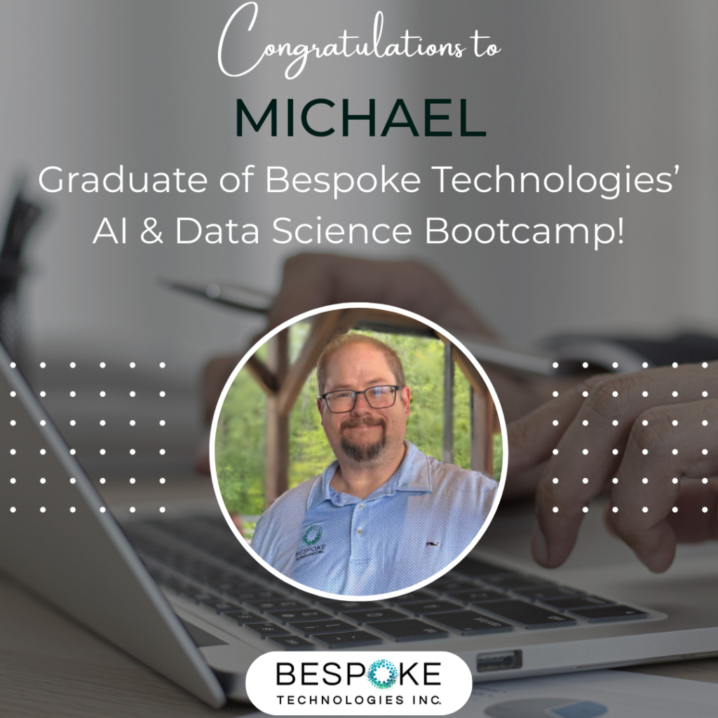 We are thrilled to celebrate a huge milestone for one of Bespoke’s own – Michael has recently graduated from our AI & Data Science Bootcamp! Through hard work and a passion for learning, Michael successfully completed the program where he learned and applied core data science, artificial intelligence, and machine learning concepts culminating with a final capstone project. The immersive bootcamp challenges participants to design a data-driven solution to a real-world problem. For Michael’s capstone project he built a machine learning model capable of predicting equipment failures, which streamlined operations and lowered costs for a commercial manufacturing vendor.